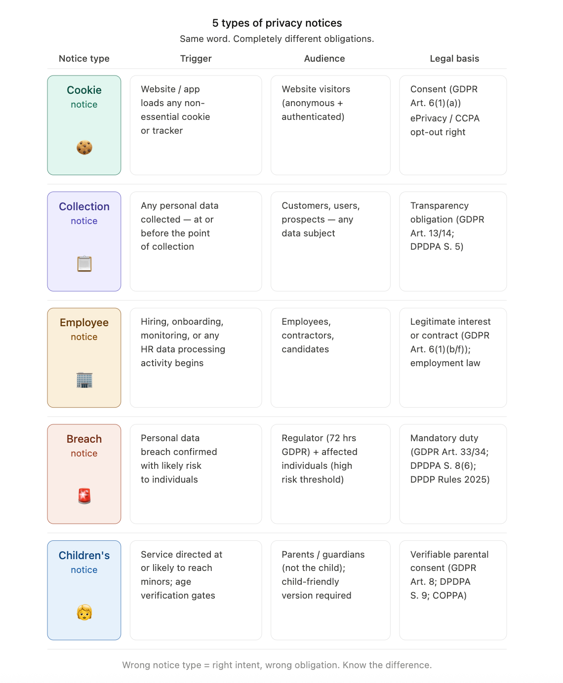 "Privacy notice" is not a singular object. It's a class of instruments, each with its own trigger event, audience, legal basis, and content requirements. Deploying the wrong notice for the context isn't a minor drafting inconsistency — it's a compliance gap. You can have the right intent and still violate the law because you used the wrong instrument for the situation.