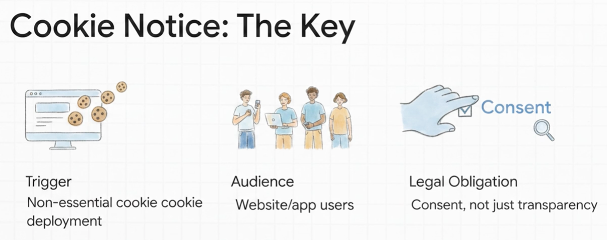 Legal obligation: Consent. Not transparency — consent. This is the critical distinction. Under the ePrivacy Directive, GDPR, and equivalents like India's DPDPA consent framework, you need affirmative, granular, and revocable consent before non-essential cookies fire. A notice that merely informs without capturing and recording valid consent is a non-compliant cookie notice. The consent must be as easy to withdraw as it was to give.