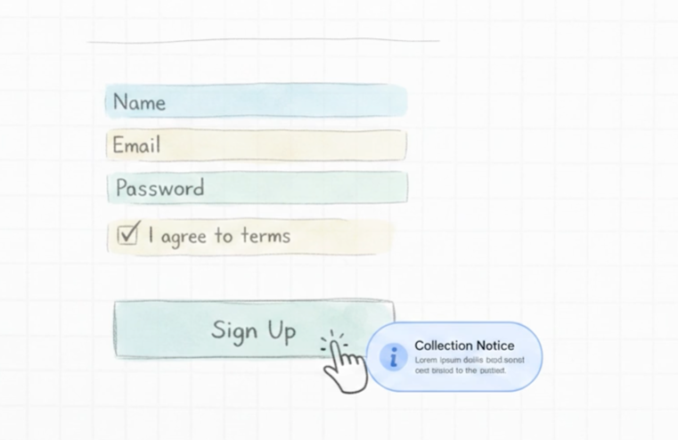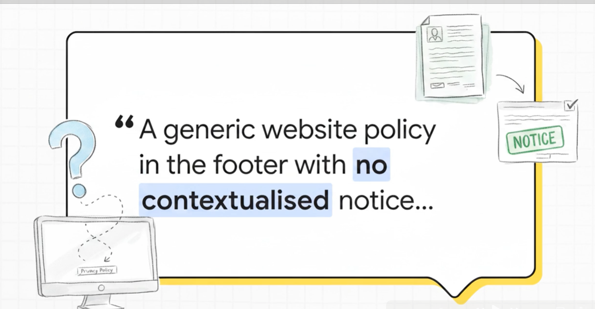 Common failure mode: A generic website privacy policy linked at the footer, with no contextualised notice at the point of collection. Technically non-compliant — the notice must be specific to the processing activity being triggered, not a catch-all document the user has to go find.
