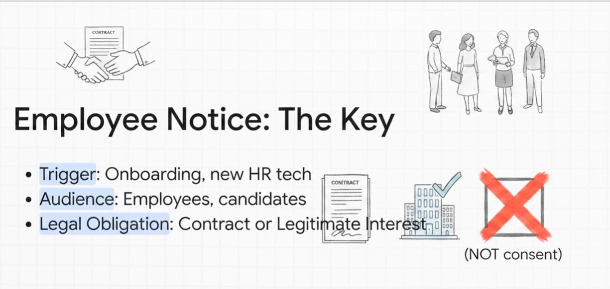 Common failure mode: Treating the employee notice as an afterthought, often buried in an HR handbook, updated when tools change but not when data flows change. If your organisation has deployed an AI-based performance tool, an employee monitoring solution, or a new HRIS — and the employee notice hasn't been updated — you have a transparency obligation gap.