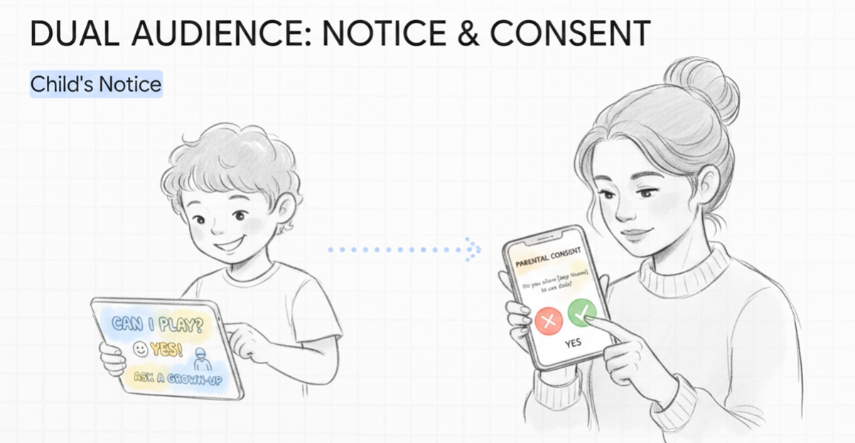 Audience: Children and their parents or legal guardians. The notice must be written at a comprehension level appropriate for the minor — plain, simple, visual where possible — while the consent mechanism must be directed at the verifiable parent or guardian.