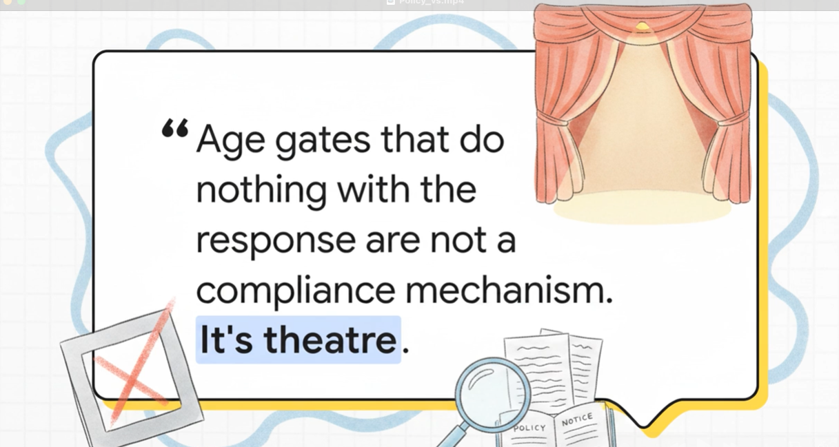 Common failure mode: Age gates that ask "Are you over 18? Yes / No" — and then do nothing with the response. This is not a compliance mechanism. It's theatre. Age-gating requires actual verification infrastructure, not a self-declaration checkbox.